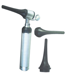 Pet/ Veterinary Otoscope, Lock fitting, brass chrome plated, double lens (lens x 1 & lens x 2), metal Pneumatic otoscopy port, 2.5V lamp, rheostat button, three black plastic reusable long speculas